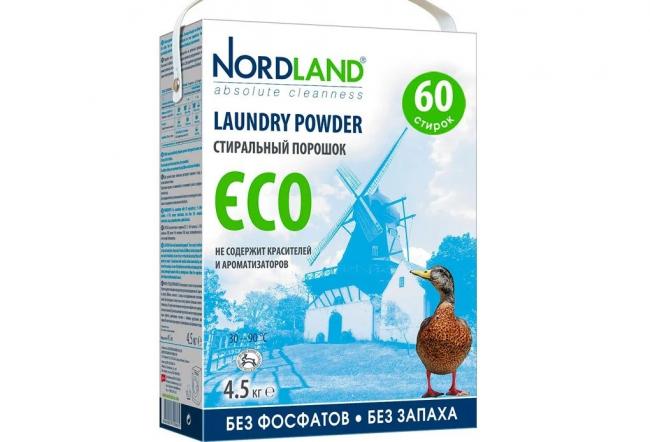 Еще одно стиральное средство от иностранного производителя – испанское Nordland ECO. Именуется порошком нового поколения, так как не содержит фосфатных солей, агрессивных отдушек и ароматизаторов, бережно удаляет пятна, полностью выполаскивается и разлагается на 90%. Изготавливается в Испании и может использоваться при каждой стирке.