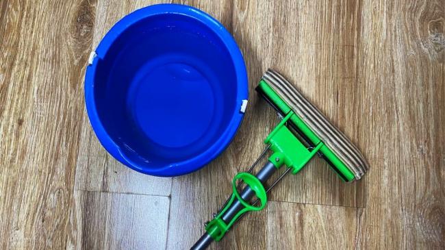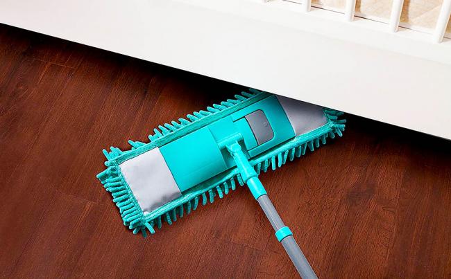 - Влажной уборкой злоупотреблять не стоит – достаточно будет провести её один, максимум два раза, в неделю. Желательно для этого использовать швабру, на которой есть функция отжима влаги. Разведите в ведре тёплую воду с моющим средством – и вперёд и с песней. Однако просто слегка протереть пол немного увлажнённой тряпкой можно и каждый день – ругаться на вас за это не будем.