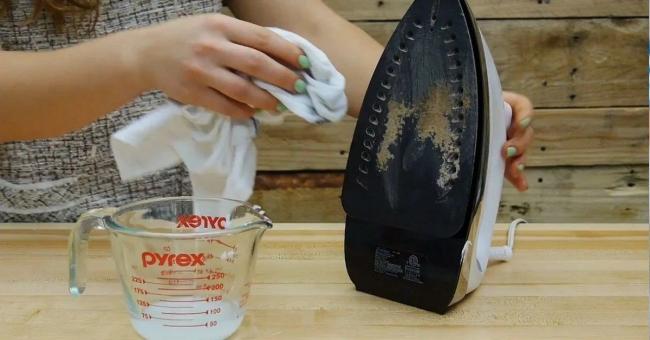 Кислотный раствор размягчит плотный слой, он легко отойдет от поверхности. Можно накрыть смоченной тряпочкой утюг, чтобы добиться удаления пригара.