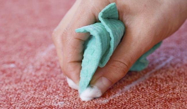 Порошком или мукой посыпают пятно, брызгают небольшим количеством воды. Втирают массу в запачканную область, оставляют до полного высыхания. Остатки порошка после собирают пылесосом или губкой