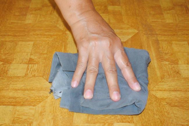 - На загрязненный участок наложить ветошь или бумагу в несколько слоев, не газету, так как она может отпечататься на покрытии.