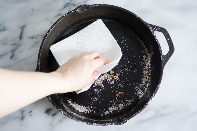 Чугунные сковорды от жировых отложений можно очистить при помощи столового уксуса и поваренной соли.