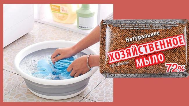 - Хозяйственное мыло применяется следующим образом: крепкий мыльный раствор взбивается в пену, которая выливается на свежее загрязнение на четверть часа. После истечения указанного времени одежду нужно постирать в обычном режиме.
