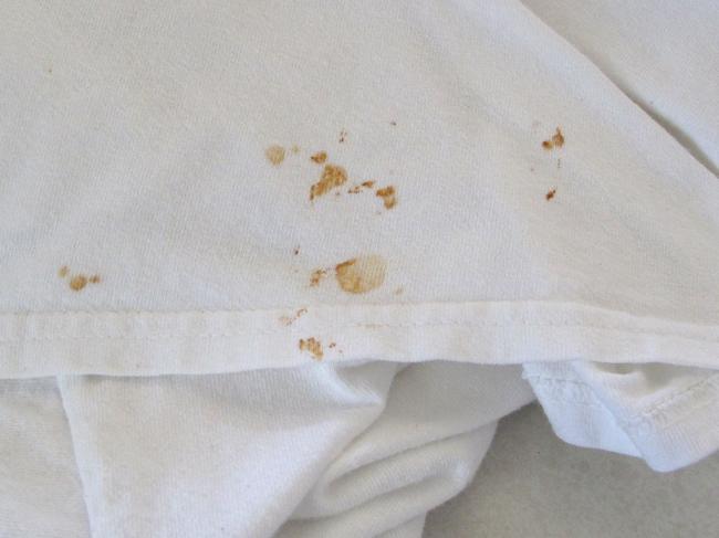 Проще отмыть ржавчину с белых вещей, ведь они невосприимчивы к воздействию кислот. Материал белого цвета не может обесцветиться, но при стойких загрязнениях не всегда удается полностью справиться ржавым следом и желто-розовый отпечаток может сохраниться даже после воздействия отбеливателя.