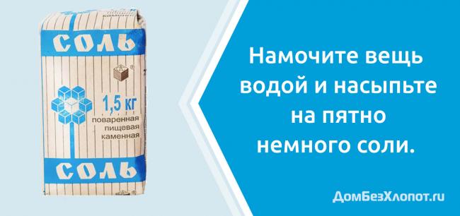 Соль нужно насыпать на проблемное место и осторожно втирать. При недостаточном результате можно повторить процедуру несколько раз. После опыта с солью можно постирать вещь хозяйственным мылом
