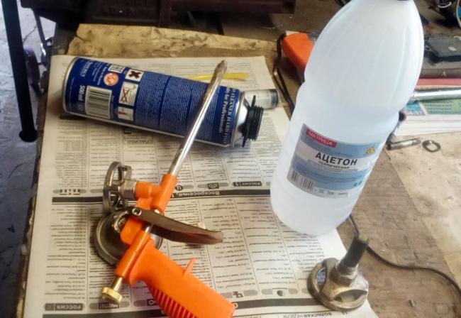 Наносить монтажную пену следует при помощи специального пистолета. В процессе работы на него также попадает герметик. Чтобы избавиться от него, следует использовать специальный очиститель для такого оборудования. После применения пистолета оборудование промывают этим очистителем.
