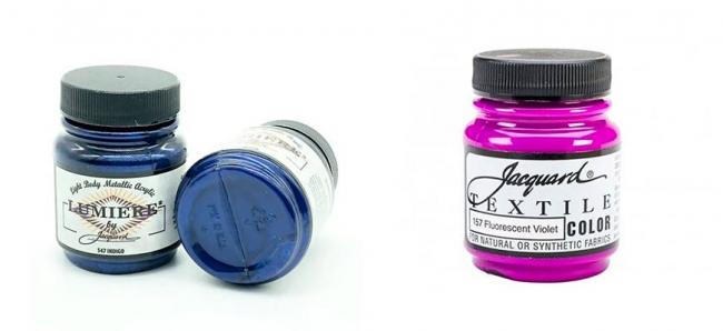 - Акриловые. Подходят для вырисовывания узоров на ткани. Можно использовать для покраски хлопка, шерсти, шелка. Содержат акрил и красящие пигменты на водной основе, безопасны при применении.