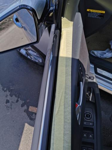 После того как верхняя часть очищена, закрываем стекло и продолжаем . Лезвие можно запускать под резинку, но аккуратно, чтобы её не порезать, главное рукой там судорожно не трусить.На самом деле с кривыми руками я умудрился пару раз коснуться пластика лезвием, благо ничего серьезного. Так что на второй двери я взял за правило: почистил — скребок отложил подальше. Никаких “ща возьму тряпку в эту же руку и вытру”.Самым долгим было вытирать стекло вдоль рамки. Оно заходит в него и скребком не подлезть. Тут как раз и пригодилась грубая тряпка. Её складывал гармошкой в несколько слоев, подсовывал туда и вытирал, переворачивая после каждого раза.