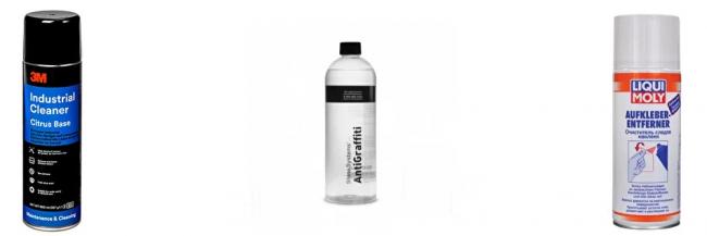 - 3М 08184. Универсальный очиститель различного типа клеёв. Выпускается в виде аэрозоля. После орошения остаётся только отмыть полученные отходы со стекла.