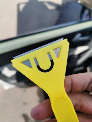 - Скребки из мягкой стали, лезвие. Кромка должна располагаться под углом 30–40 градусов к поверхности. Счищать слой необходимо без нажима, плавными движениями. Адгезив легче всего очистить сразу после нагрева и отсоединения плёнки, поэтому операцию очистки желательно производить сразу после снятия тонировки.