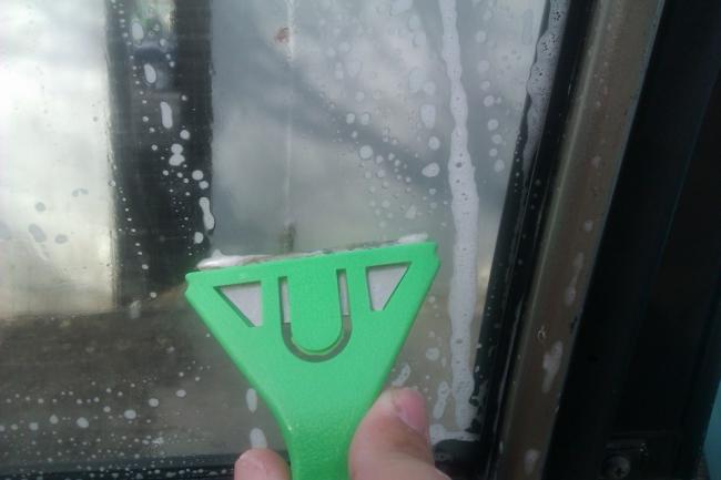 «Мистер Мускул» придет на помощь. Распыляете средство для мытья над пораженной областью. Фибровой губкой отчищаете любые загрязнения, потом моете окно чистой водой.