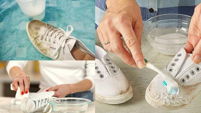 Сначала удаляют отметину, потом кеды стирают