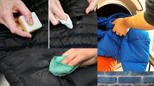 Пятнышки посыпают смесью талька и измельченного мела. Сверху кладут чистую бумагу и прижимают тяжелым грузом. Через 10 – 12 часов пуховик отправляют в стиральную машину.