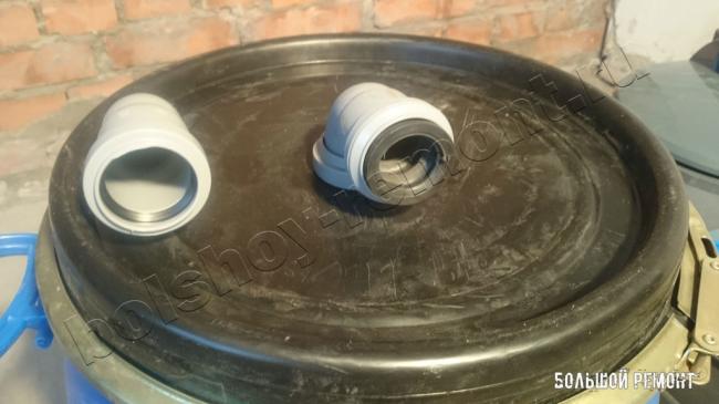 В крышку ведра устанавливаем пластиковые отводы 90° канализационной трубы, диаметром 50 мм.