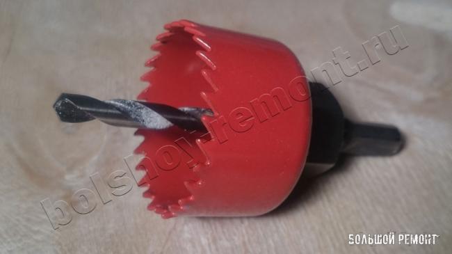 Первым делом, в крышке бочки необходимо сделать два отверстия. Диаметр раструба фановой трубы равен 44 мм, поэтому и коронку буду использовать именно такого диаметра. Коронку по дереву такого диаметра удалось найти только в наборе. Пришлось раскошелиться на набор!