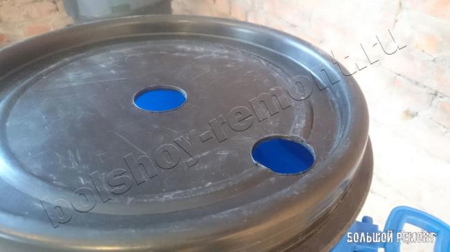 Лобзиком вырезают из фанеры два круга диаметром, немного меньшим, чем у крышки бочки. В заготовках делают сначала два отверстия под болты и закрепляют ими детали с обеих сторон крышки. Далее просверливают остальные дырки, снимают круги и шкуркой удаляют заусенцы. Наносят по периметру заготовок герметик, размещают детали на крышке и полностью устанавливают крепеж. По центру фанерных кругов выполняют отверстие под шпильку, а чуть в стороне – под забор воздуха моторным блоком.