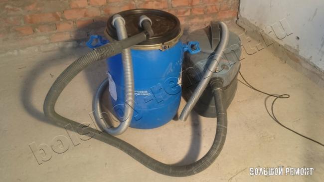 На фото готовый циклон с пылесосом. Такой циклон отлично отделяет пыль от воздуха. Им хорошо пылесосить строительный мусор.