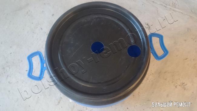 Сверлим два отверстия, коронкой, диаметром 51 мм в крышке ведра будущего циклона. Это ведро из под полимерной шпаклевки. В таких ведрах продается финишная шпаклевка многих производителей.