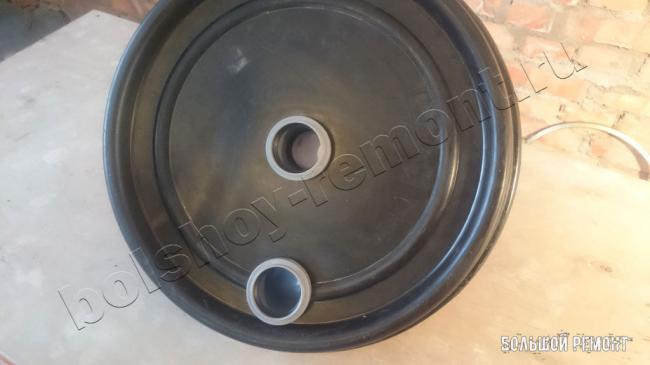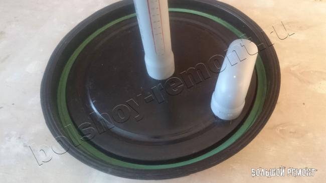 - Контейнер для отходов перевернут. На выступающую трубку надевается уплотнительное кольцо из пористой резины, которое прижимается ко дну емкости. Для герметизации стык обрабатывают силиконом.