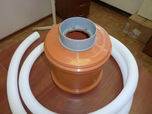 - Недалеко от основания конуса, в его широкой части просверливается отверстие под трубку, для соединения с гофрированным шлангом. Через него будет всасываться различный строительный мусор.