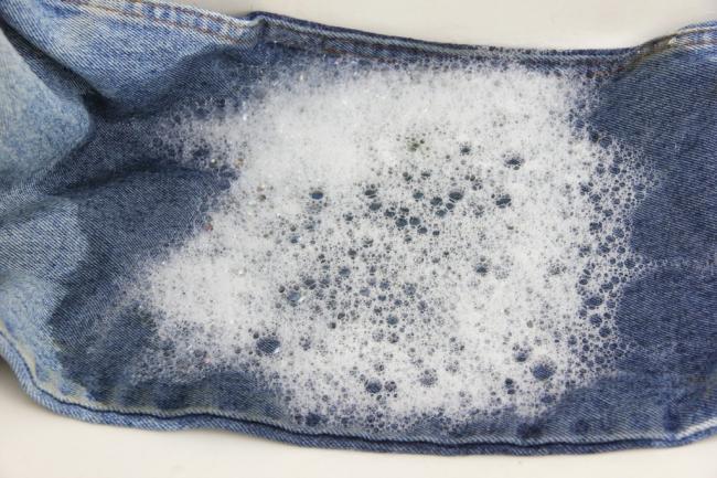 - Образовавшиеся отдельные пятна на джинсах можно попытаться удалить влажной губкой, смоченной в газированной воде с добавлением соли. Смачивать пятно необходимо с изнаночной стороны. Этот метод не подходит для удаления жирных пятен. В этом случае пятно нужно промокнуть сухой салфеткой, затем посыпать его на несколько часов солью или детской присыпкой. После высыхания щеткой счистить остатки с очищаемого участка.