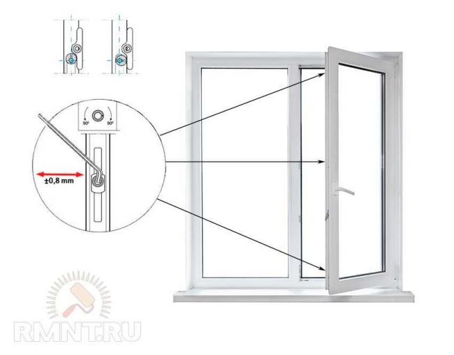 Если ручка окна не закрывается до конца и выявлено нарушение геометрии оконной створки, то необходимо провести ее регулировку . Окно может быть отрегулировано в трех основных направлениях: