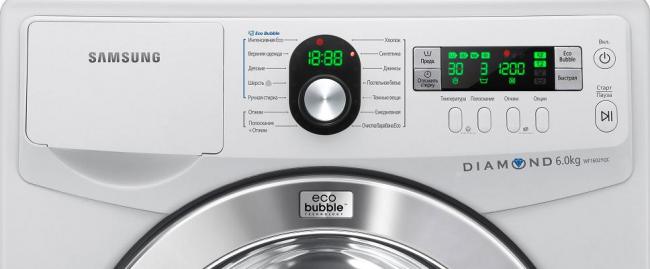 Славится лаконичным дизайном в стиле минимализм. Владельцам самсунговской техники в этом плане повезло: каждый режим стирки расписан словами, что облегчает процесс настройки. Кнопки температуры, полоскания и отжима находятся с левой стороны. Регулирование опций происходит с помощью нажатия на соответствующие кнопки.