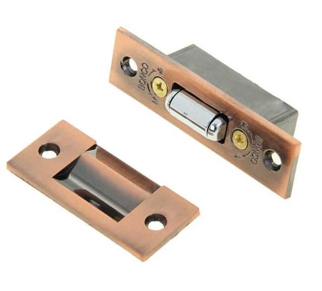 Первую устанавливают на дверь, а вторую — на раму. Захват имеет металлическую скобу, которая плотно фиксирует выступающий элемент. Особенности механизма позволяют удержать дверь в закрытом состоянии, но можно при небольших усилиях открыть створку снаружи. Для данного типа фиксирующего механизма и для роликового дополнительно монтируют ручку с внешней стороны двери. Она стационарная и часто имеет форму лепестка.