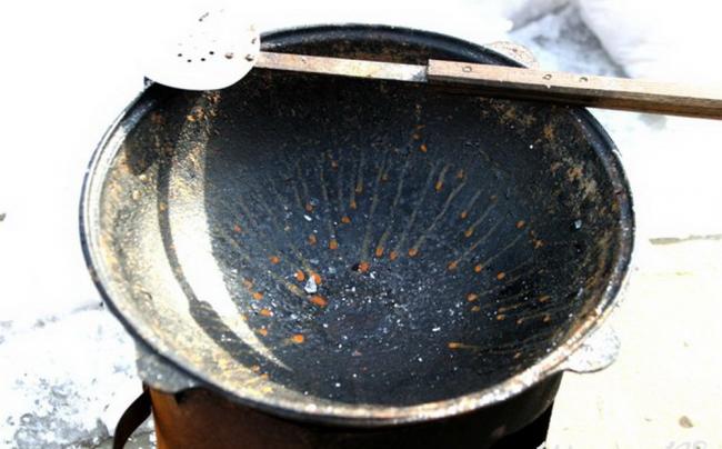 - Чугунный казанок с налитым маслом необходимо поставить на слабый огонь. Когда посудина начнет нагреваться, ее стоит наклонять таким образом, чтобы жир покрыл все стенки.