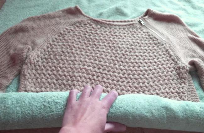 Выкручивать и выжимать одежду нельзя, рекомендуется завернуть её в толстое махровое полотенце, чтобы убрать часть влаги. Досушивать лучше в горизонтальном положении, разложив и расправив вещи на ровной поверхности, укрытой полотенцем или простыней. При сушке в подвешенном состоянии вещи могут растянуться.