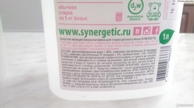 Суперконцентрат также эффективен в холодной и жесткой воде. Synergetic ECO хорошо очищает грязь с натуральных, синтетических, цветных и белых тканей благодаря своей формуле с пятью энзимами, натуральным мылом и растительными поверхностно-активными веществами.