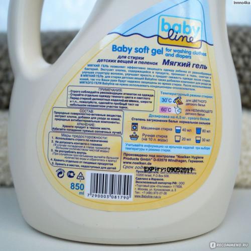- «Babyline». Хорошо отстирывает даже застаревшие пятна на доставшихся по наследству от старших братьев и сестер вещах. Подходит аллергикам и атопикам так как в составе отсутствуют отдушки и химически компоненты. Хорошо растворяется, экономно расходуется и защищает спираль стиральной машины от накипи.