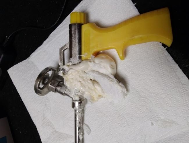 Иногда советуют перед началом работ смазать руки (без перчаток, конечно) растительным маслом или вазелином. Что ж, теми, кто сумеет удержать баллон с пеной и пистолет жирными руками и при этом не «залапать» все окружающие предметы, можно только восхищаться. Остальные быстро пойдут отмывать кожу от жира и отчищать инструмент.
