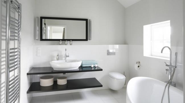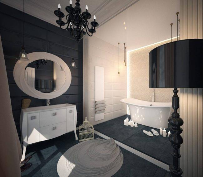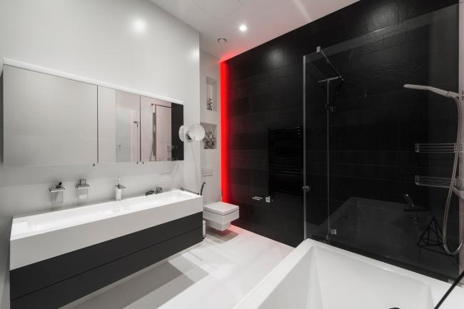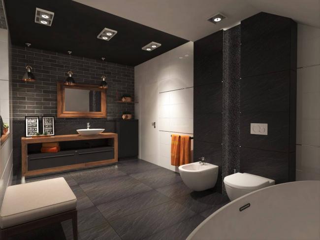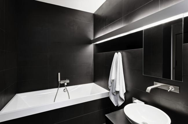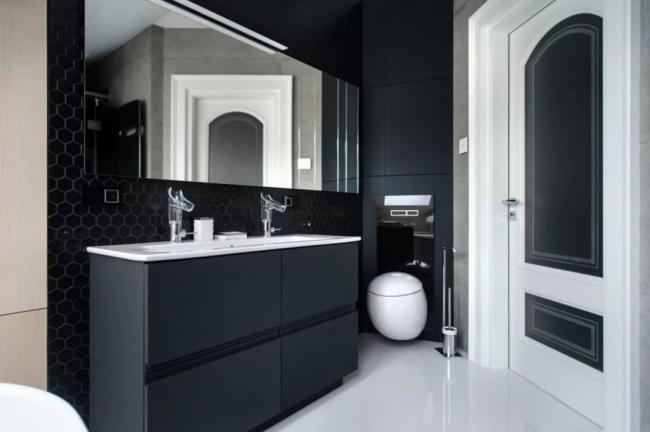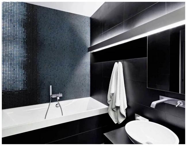 Делать ванную полностью в черном не совсем камильфо, потому стоит добавить нотки светлых оттенков.