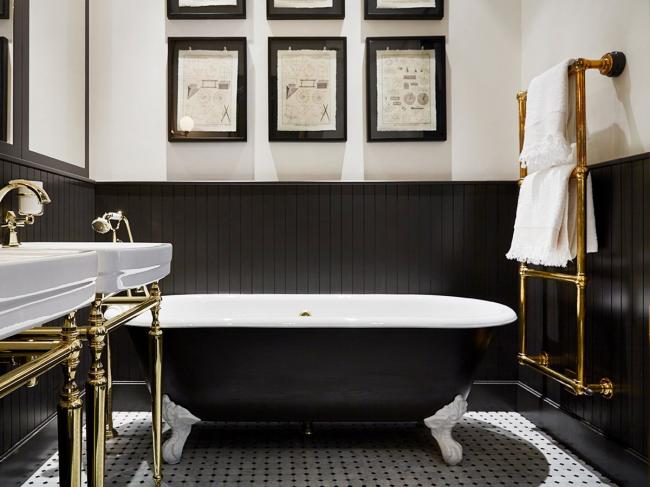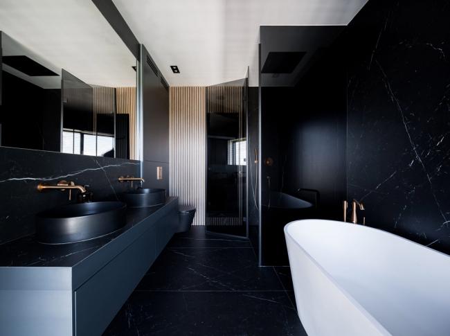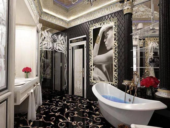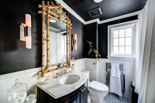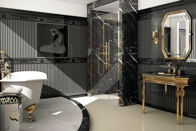 Чёрная ванная комната в классическом стиле, сочетание чёрного и золотого цветов