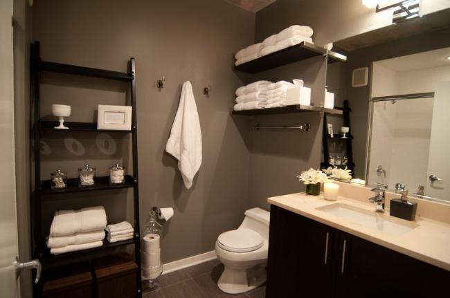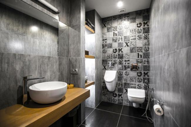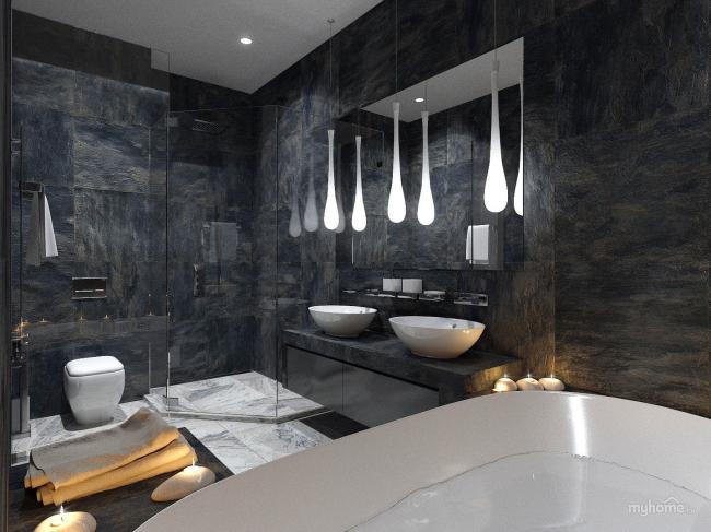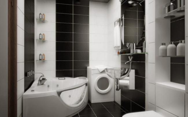 Отделка может быть монохромной с включением светлых либо серых деталей. Интерьер дополняется модными кранами, смесителями, угловой купелью, пластиковыми шторками.