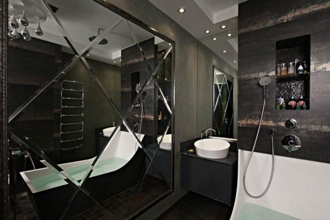 - Известно, что черный цвет поглощает свет, поэтому наличие светоотражающих элементов интерьера будет обязательным условием декорирования черной ванной. Это могут быть зеркала, хромированные детали сантехники, стеклянные и хрустальные светильники.