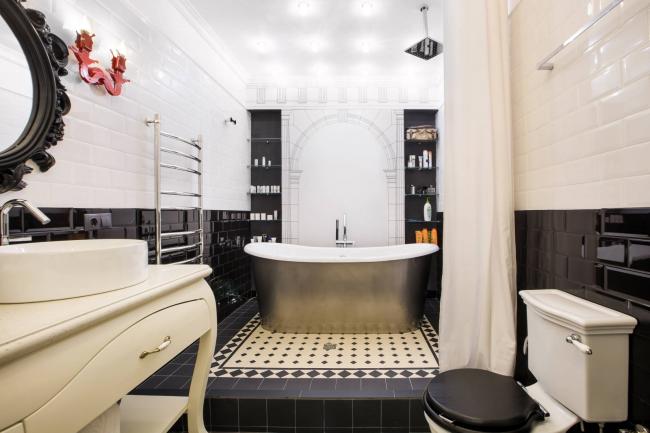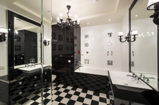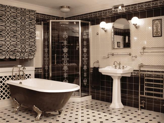 В отделке стен хорошо смотрится шахматная раскладка плитки. Сантехническое оборудование подбирается массивное, для него характерны плавные переходы линий, хромированные детали из стали.