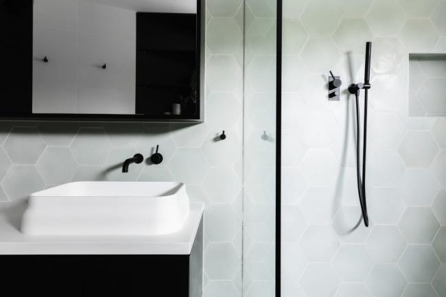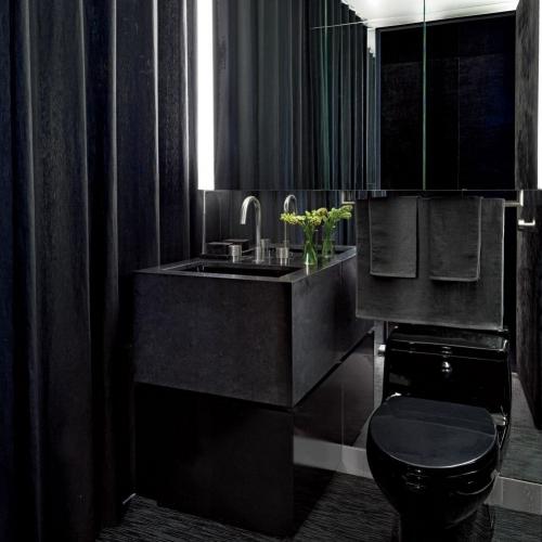 Американский дизайнер Томас Френис сделал главной идеей своего проекта раскладку плитки. Причем, сложного ничего нет: обыкновенная глянцевая плитка чёрного цвета на стенах и абсолютно белая затирка швов. Интерьер далеко не только чёрный, здесь очень много дополнительных белых элементов: вся сантехника белая.