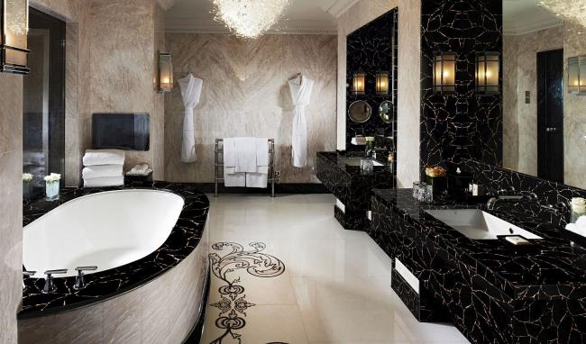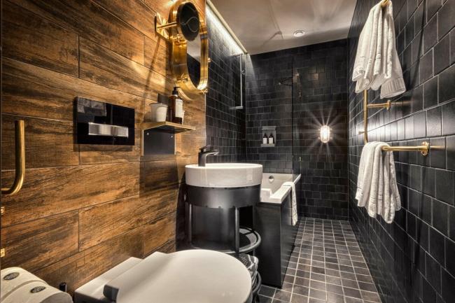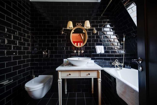 В отеле Dom boutique hotel» в Санкт-Петербурге санузел в номере класса люкс подчёркнуто роскошен. Он выполнен с элементами дворцовой классики и чёрные стены здесь дополнены небольшими позолоченными аксессуарами. Белая мебель создаёт классическое контрастное сочетание. Пример демонстрирует, как использование позолоченных элементов в чёрной комнате подчёркивает респектабельность и роскошь.