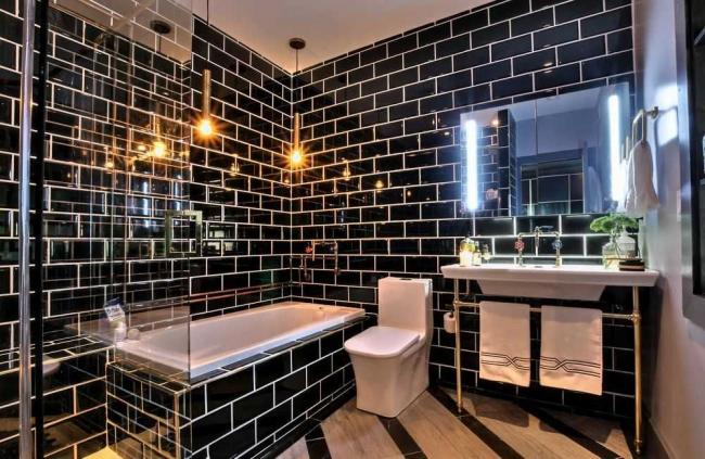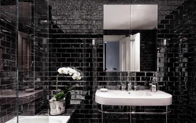 Чёрная глянцевая плитка с белыми швами на стенах в ванной