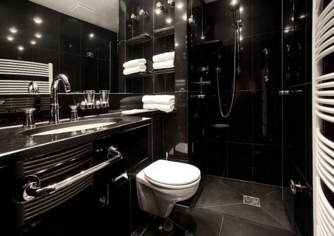 Главное – не перестараться с черным, иначе обстановка получится гнетущей. В виде вкраплений рекомендовано применение светлых деталей, например, потолочной поверхности, полотенец. Оттеняющие элементы играют важную роль в таком дизайне.