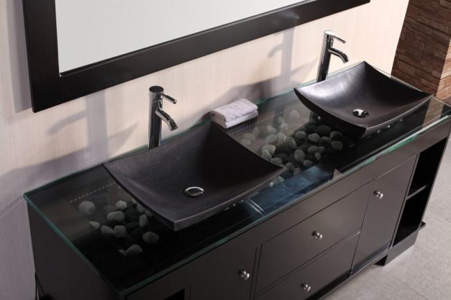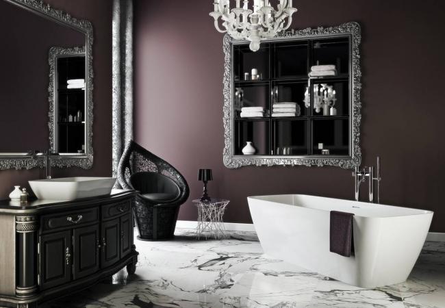 В классике применяются пестрые контрасты, а также белый и черный цвет. Они привносят в интерьер графичность, делают его лаконичным. Замечательно будет смотреться мраморная чаша на антрацитовом фоне. Необязательно из натурального камня, качественная имитация также допускается.