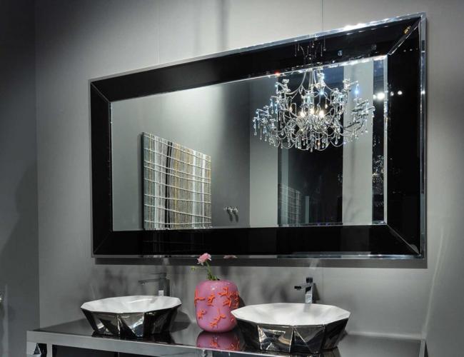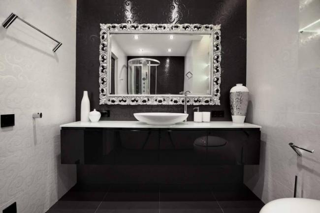 Оригинальной идеей является использование зеркала в черной раме в интерьере ванной комнаты. Его легко сделать изюминкой оформления. Раму чаще всего выбирают металлическую или деревянную, черный цвет ей придают путем окрашивания.