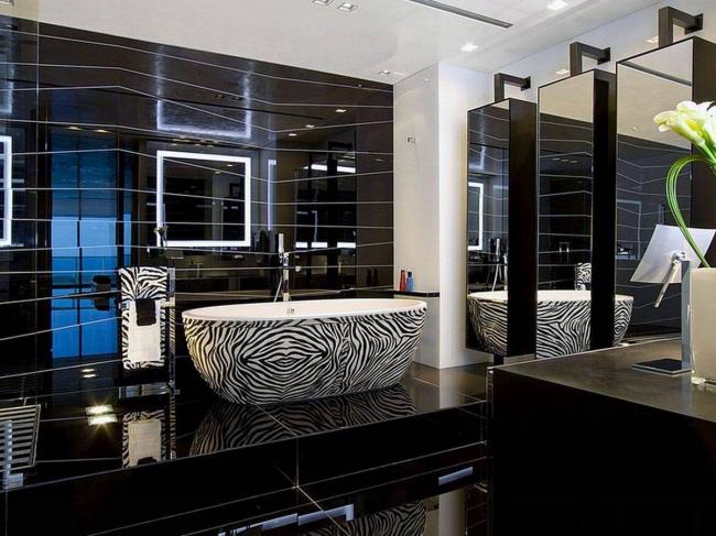 Если ванная находится в помещении с большим окном, то, чёрный будет уместен потому, что этот цвет имеет минимальный коэффициент цветового отражения, таким образом чёрная обстановка компенсирует избыток света. Несмотря на обилие чёрного, в дневное время такая комната не будет выглядеть мрачно, наоборот она будет способствовать концентрации зрителя на панораме, которая открывается за окном.