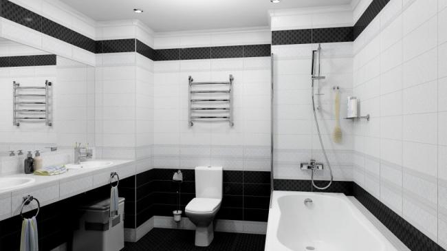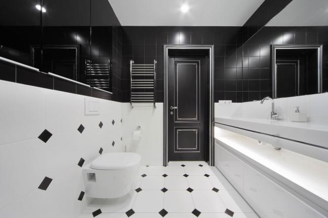 Контрастное сочетание черного и белого цветов считается классическим. Эта пара будет как нельзя лучше смотреться в интерьере ванной комнаты. Белый цвет – отличный партнер для черного, так как компенсирует главный его недостаток – поглощение света.