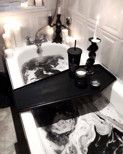Ванная комната, оформленная в черном цвете, как никакая другая нуждается в ярких акцентах. Дополните интерьер цветовыми пятнами. Коврик яркого, насыщенного цвета будет прекрасно смотреться на однотонном черном полу. Ароматические свечи в красивых подсвечниках с любимым запахом помогут расслабиться и поднять настроение. Если позволяют размеры ванной комнаты, разместите на стенах картины или постеры.