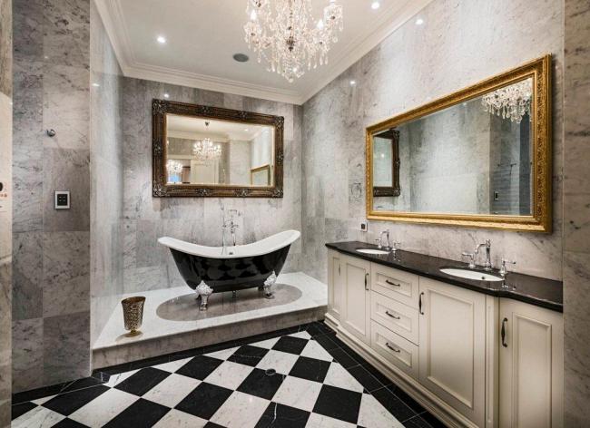 Напольное покрытие чаще всего делают мраморным, а столешницы – из натурального камня. Как альтернативу дорогому материалу можно рассмотреть кафель с поверхностью, имитирующей гранит или мрамор. Ванную лучше выбрать на медных ножках с узором.