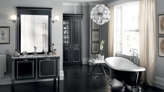 Классика хороша тем, что она вечна и не утрачивает актуальности с течением времени. Такое оформление ванной комнаты отражает наличие хорошего вкуса у собственников недвижимости. Черный цвет нередко комбинируется с белоснежным. Причем необязательно с чисто белым, предпочтение обычно отдается молочным и кремовым оттенкам. Цветовые переходы по возможности делаются мягкими.