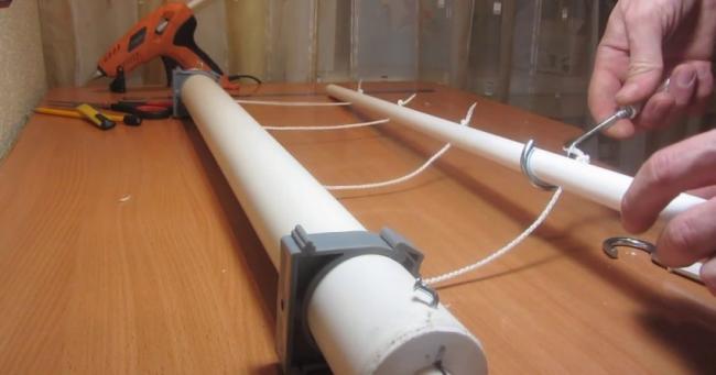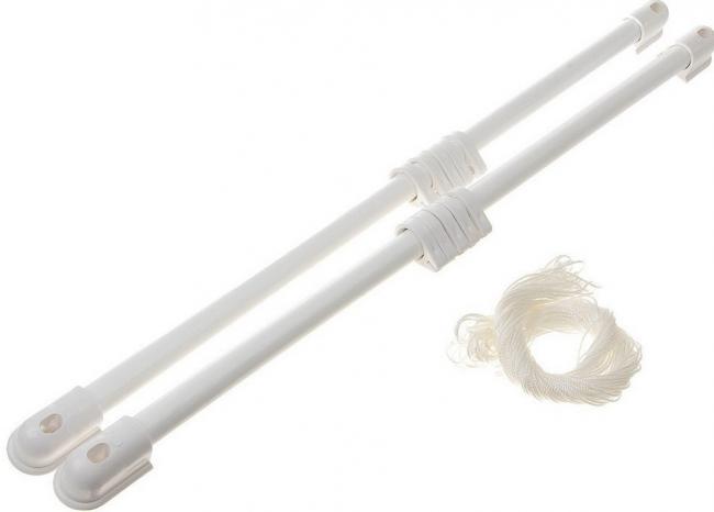 - Протягиваем шнуры через кронштейны с роликами и закрепляем на них фиксаторы высоты.